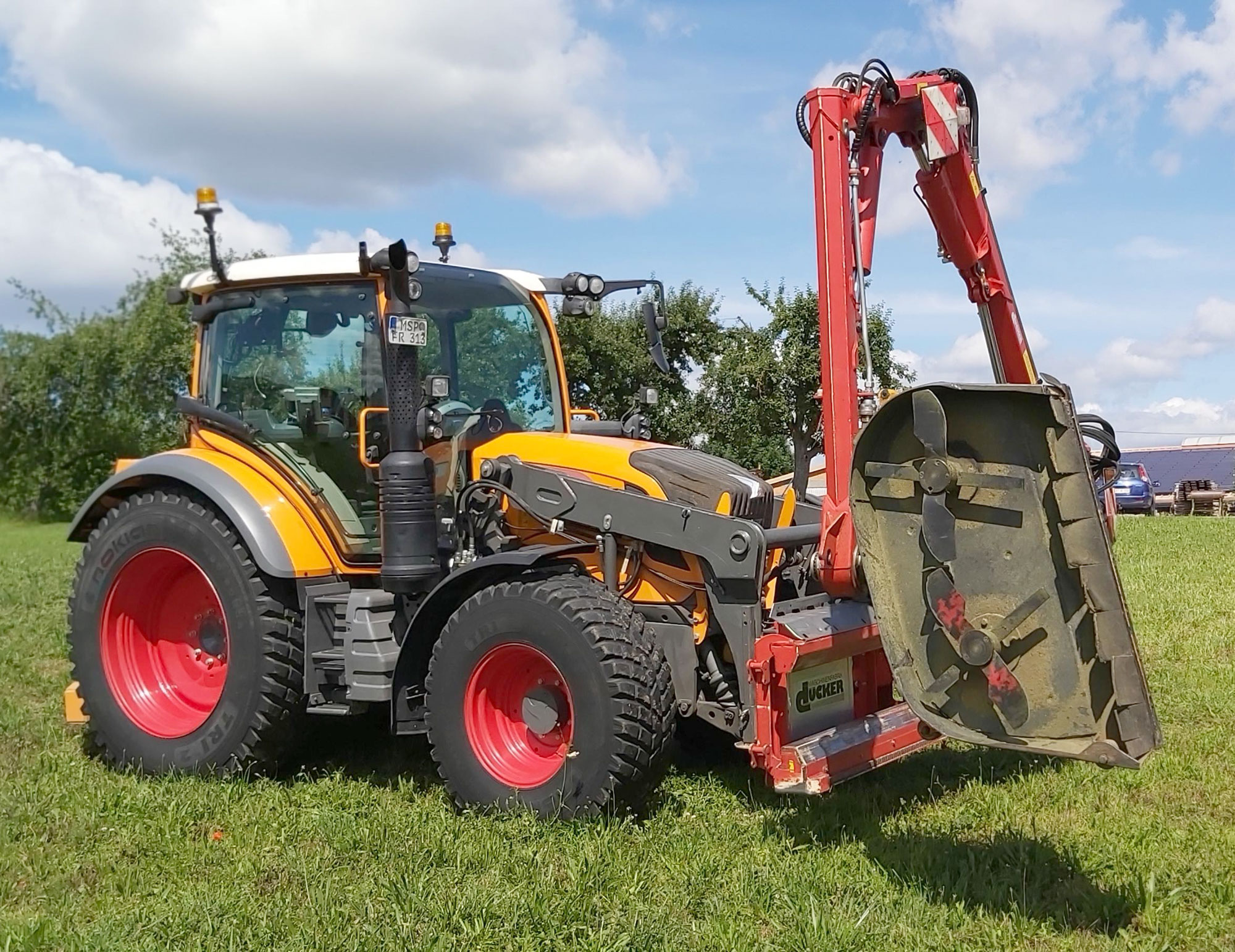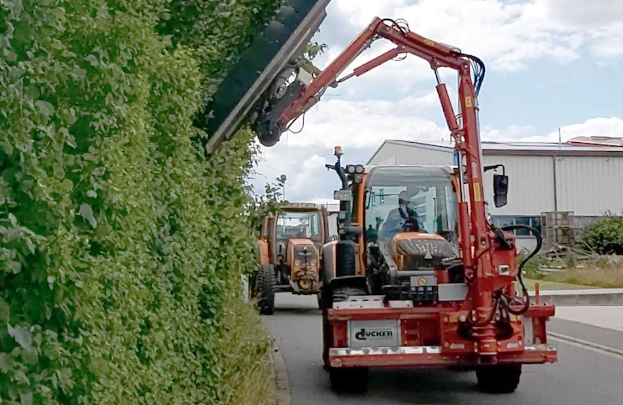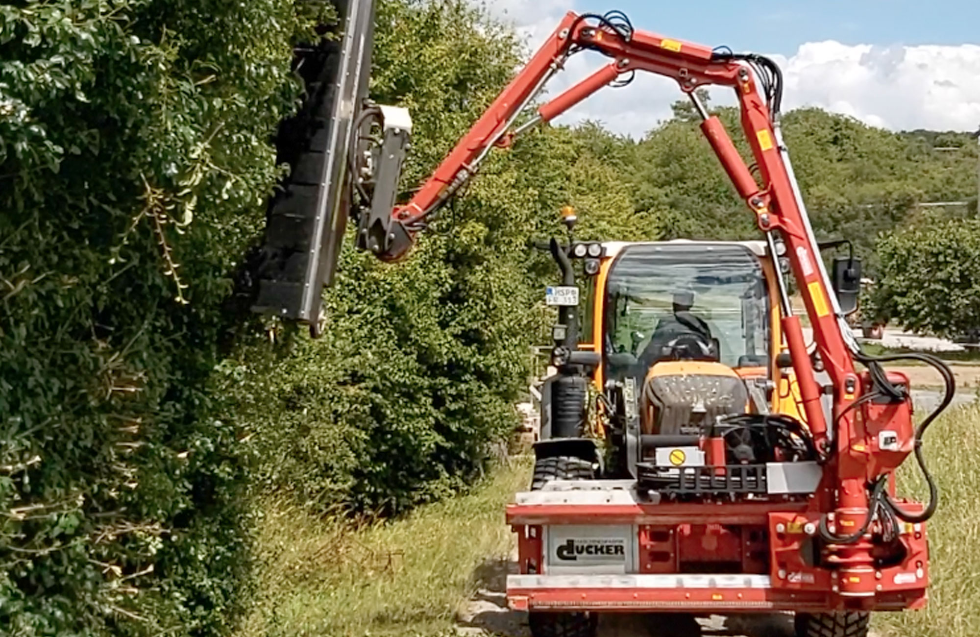 Böschungsmäher (7m RW), mit einem speziell für diese Pflegearbeit entwickelten Anbaugerät, erleichtert das Heckenschneiden maßgeblich. Die sehr schnell rotierenden Messer hinterlassen einen sauberen Schnitt und zerkleinern gleichzeitig das Schnittgut. Das bedeutet, erhebliche Arbeitserleichterung gerade bei großen Höhen.